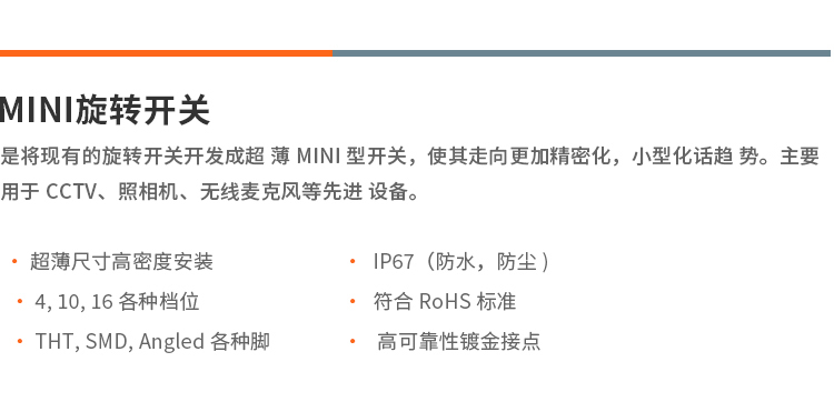 用户将转轴手柄旋转至所需端位, 可体现BCD Code化的输出值。主要用于自动化 设备、控制设备、家用电器、安全设备、音响器 具等大部分产业设备。