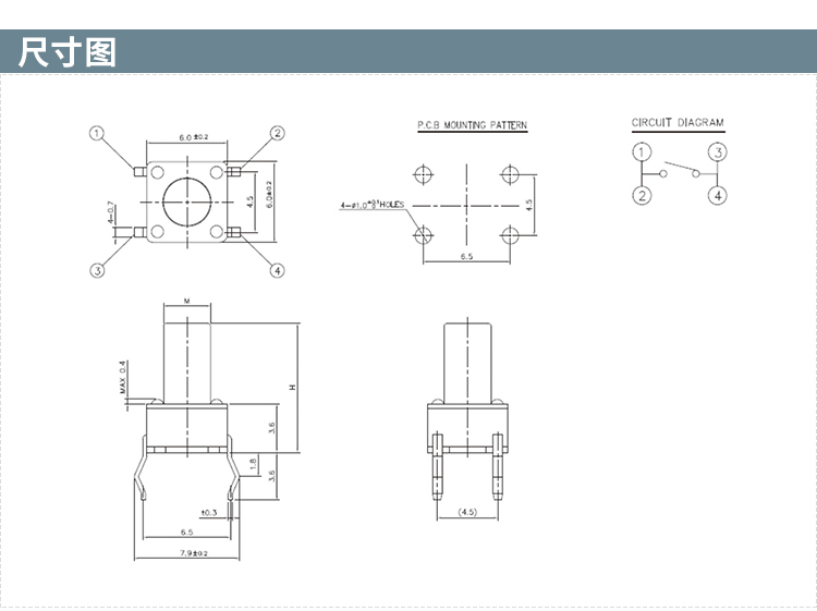 STP-1230A(塑胶面盖)四脚DIP插件6*6*4.3轻触开关